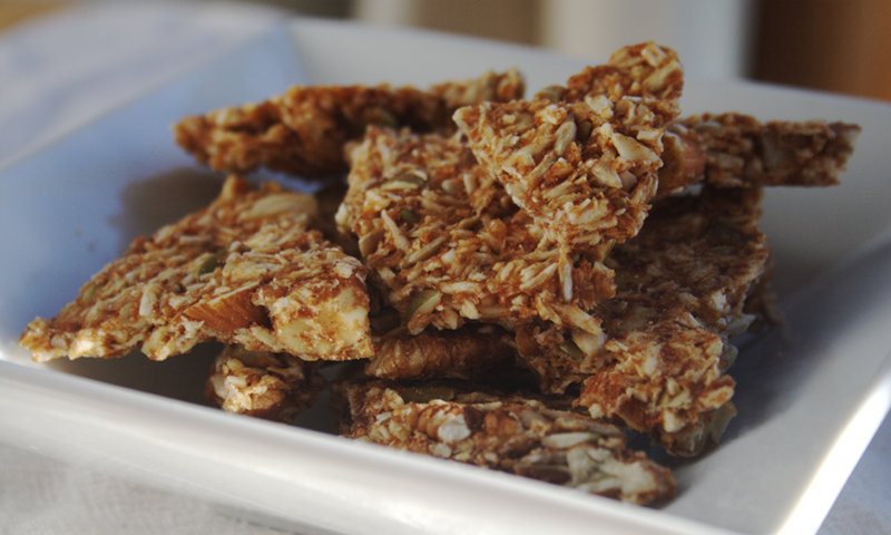 While I liked her products, her nutty coconut granola was my favorite. It’s a combination of nuts, seeds, and fruits that is dehydrated into a crispy sheet that can be broken into pieces and eaten as a great breakfast on the go, or combined with greek yogurt to make a tasty breakfast/dessert. While I made this in a dehydrator (borrowed from my friend, Alex), it could probably be made in a low oven. Cycle the oven on and off at it’s lowest temperature (probably at half hour increments) for a few hours. Check and see if it’s crisp, if not, continue cycling for a few more hours.